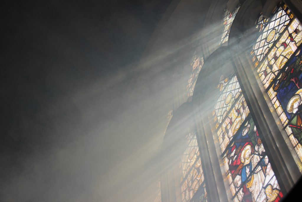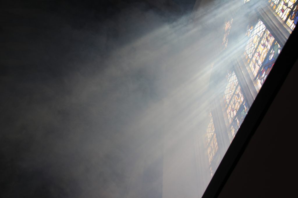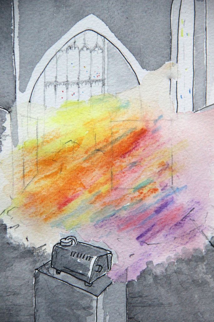 Part of OSR Projects Palaces & Cabins exhibition this work playfully explored the traditions and architecture of Salisbury Arts Centre, a former church building, using a hidden smoke machine operated by front of house staff when the sun shines; igniting a cloud of fog that is coloured by light passing through the stained glass windows.